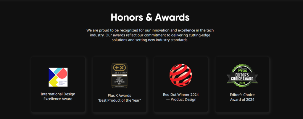 - Red Dot Winner 2024 — Product Design:Dieser renommierte Preis ehrt die herausragendsten Industrieprodukte, die von einer Expertenjury aufgrund ihres außergewöhnlichen Designs, ihrer funktionalen Innovation und ihrer Langlebigkeit ausgewählt wurden.