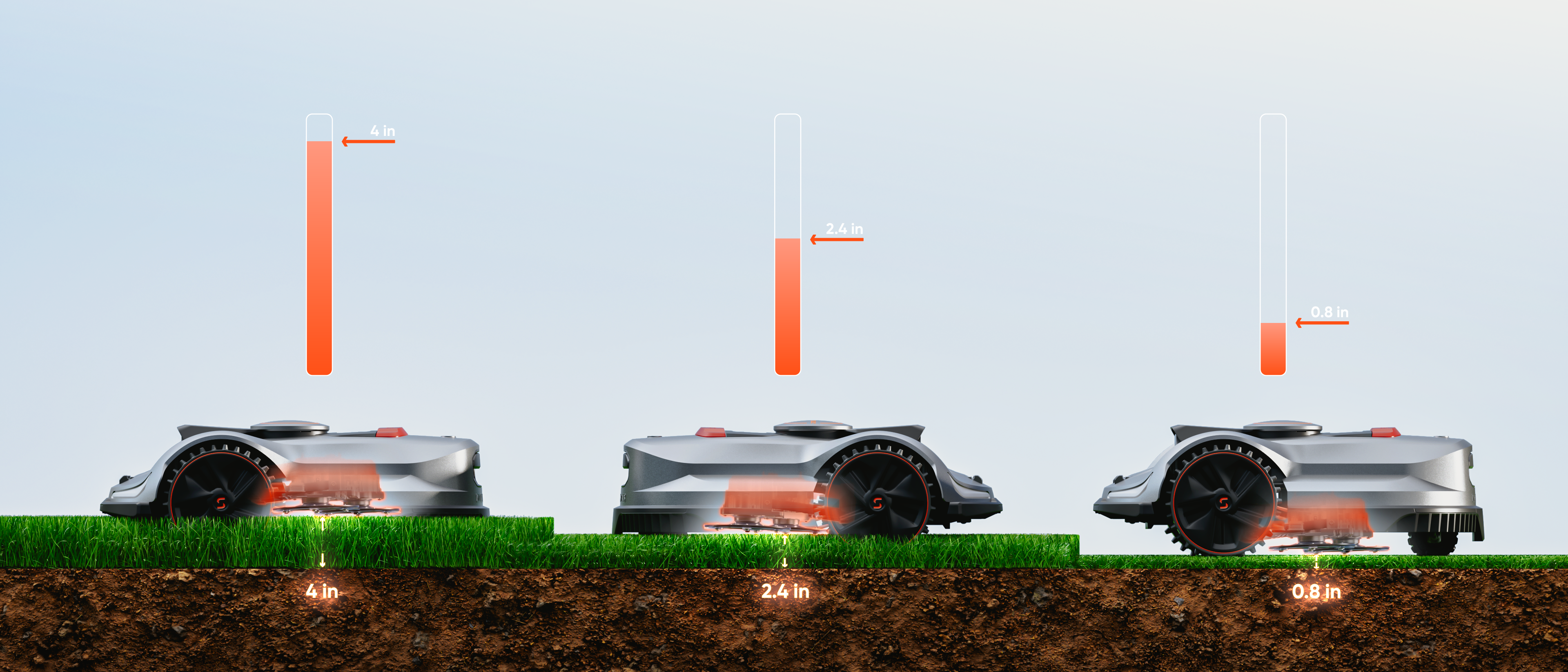 Continuous cutting height adjustment from 0.8-4.0 in. When mowing tall or dense grass, you can set the target height on your phone and let the mower cut in multiple passes to ensure a smooth and effective finish.
